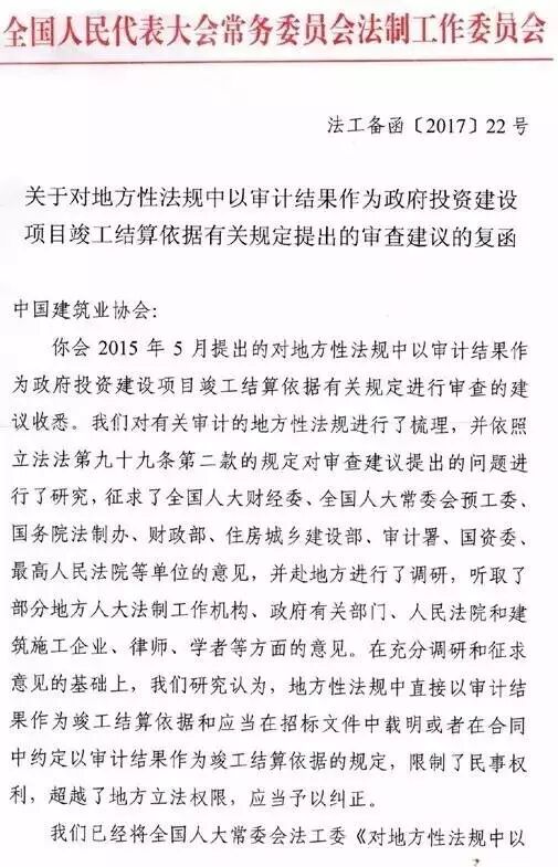 全国人大常委会法工委日前在回复中国建筑业协会《关于对地方性法规中以审计结果作为政府投资建设项目竣工结算依据有关规定提出的审查建议的复函》中提出,地方性法规中直接以审计结果作为竣工结算依据和应当在招标文件中载明或者在合同中约定以审计结果作为竣工结算依据的规定,限制了民事权利,超越了地方立法权限,应当予以纠正。且法工委已将研究意见印送各省、自治区、直辖市人大常委会。目前,有关地方人大常委会正在对地方性法规中的相关规定自行清理、纠正。