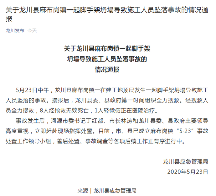 突发!8死1伤,5月23号广东龙川发生脚手架坍塌事故